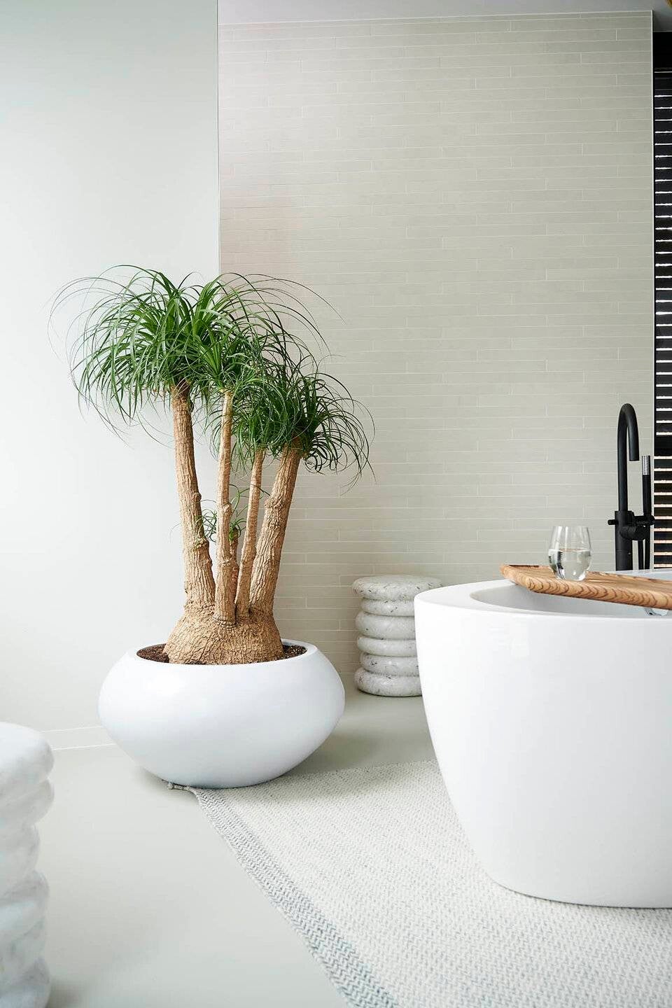 La Beaucarnea est une plante d’origine mexicaine reconnaissable à son tronc renflé à la base, qui stocke l’eau, et à ses longues feuilles fines retombantes.