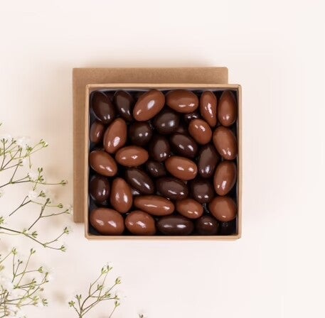 Amandes enrobées de chocolat noir et lait. Chocolat pur beurre de cacao