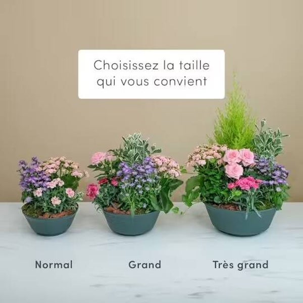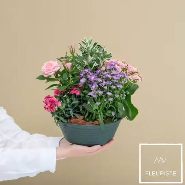 Un assemblage de plantes fleuries à dominante rose et vert, que votre destinataire pourra chouchouter puis replanter dans le jardin.